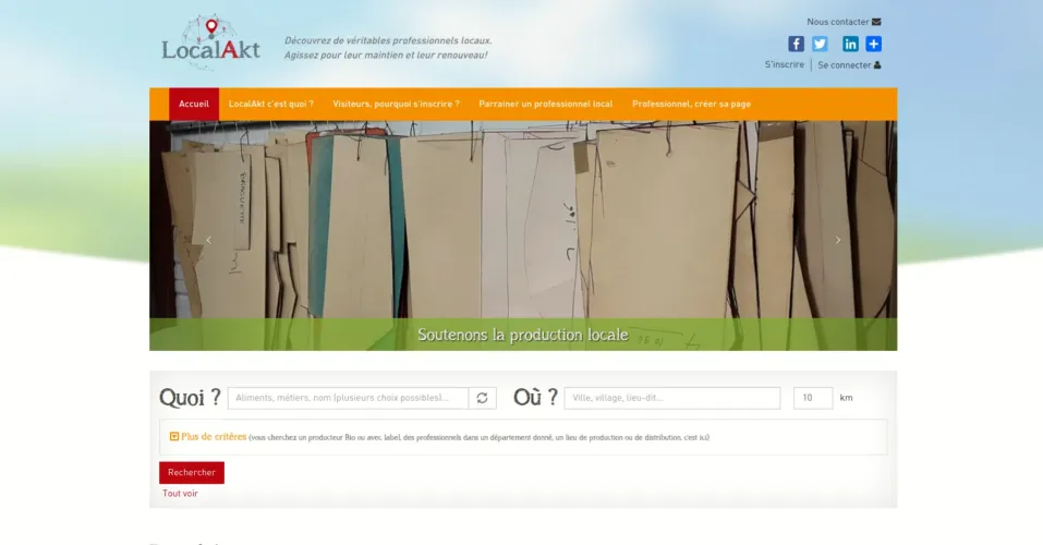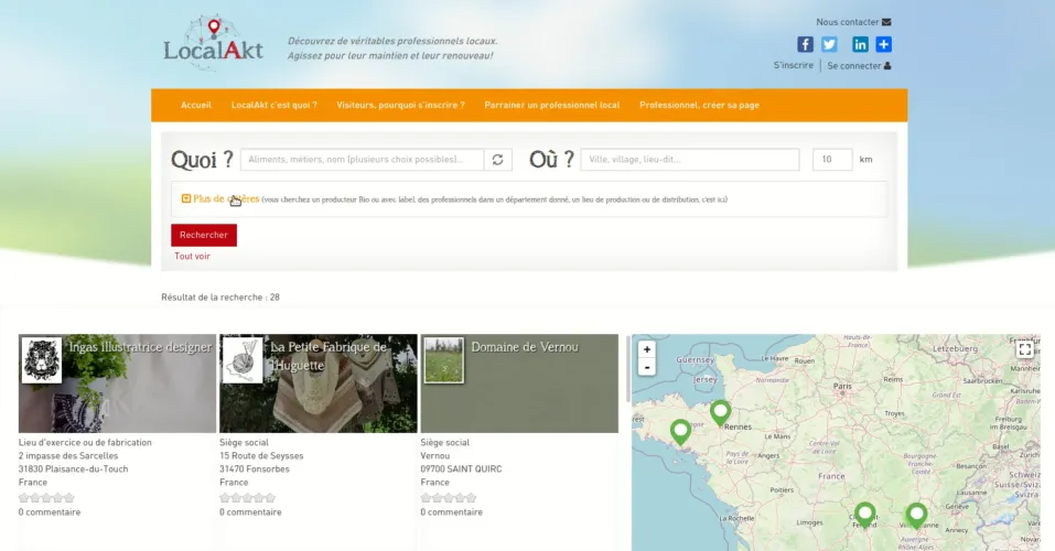 Création et développement d'une plateforme de recherche pour les professionnels locaux par le biais de la taxonomie et/ou de la géolocalisation. Chaque nouvel utilisateur peut créer un profil et créer sa fiche représentant sa profession